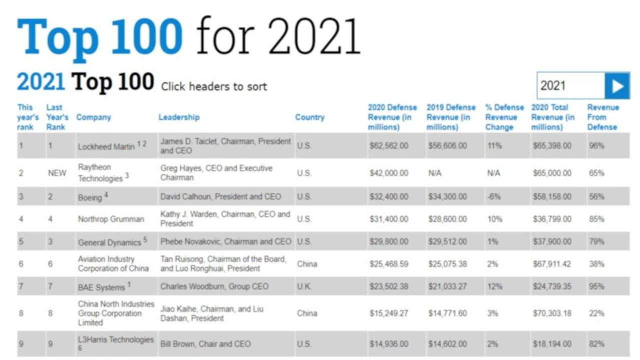 | This year's rank | Last Year's Rank | Company | Leadership | Country | 2020 Defense Revenue (in millions) | 2019 Defense Revenue (in millions) | % Defense Revenue Change | 2020 Total Revenue (in millions) | Revenue From Defense |
