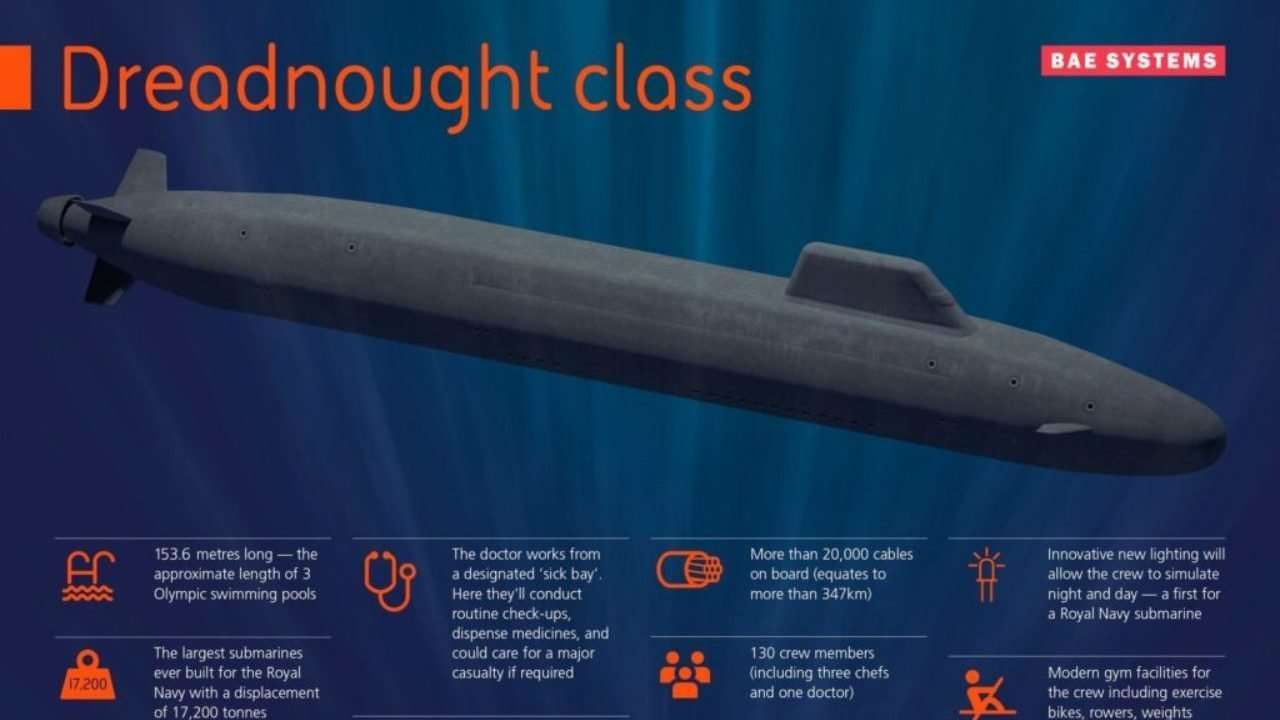 وكانت وسائل إعلام قد أشارت سابقا إلى أن غواصات Dreadnought ستكون أكبر غواصات صاروخية في سلاح البحرية البريطاني، وسيبلغ طول كل واحدة منها 153.6 م، ومقدار إزاحتها للمياه سيعادل 17200 طن.