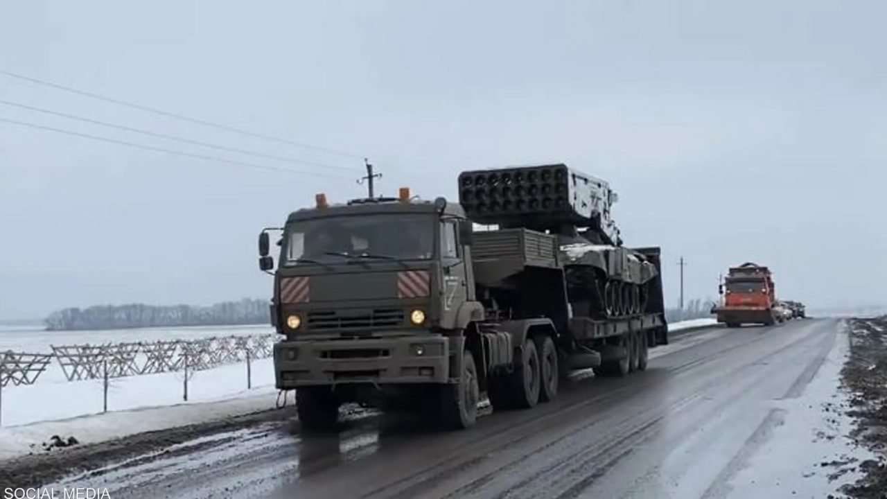 رصدت مقاطع فيديو شاحنة عسكرية روسية قرب أوكرانيا، وتحمل على متنها راجمة صواريخ تعرف باسم "قاذفة اللهب"، وهي واحدة من أخطر الأسلحة في العالم.