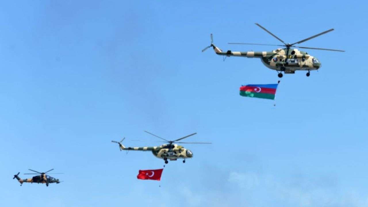 وفي نهاية المناورات، نفذت المروحيات العسكرية طلعات استعرضت خلالها العلمين التركي والأذربيجاني.