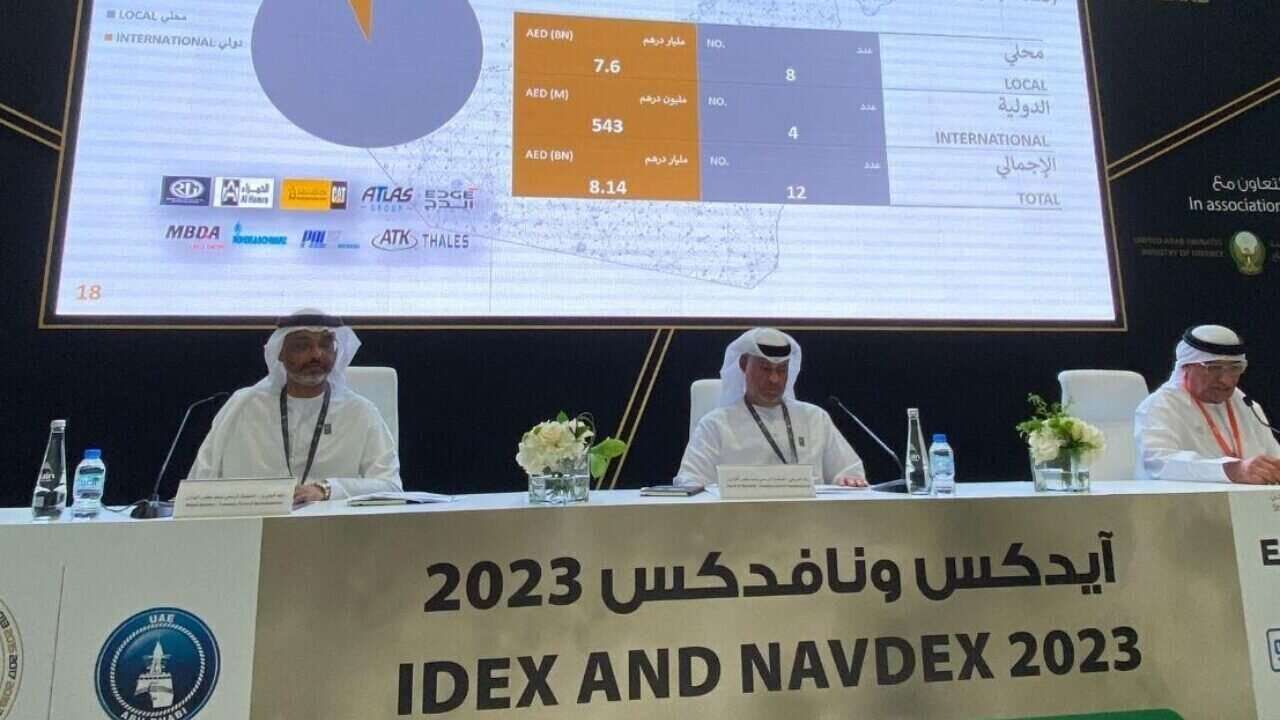 وقال زايد المريخي، إن إجمالي الصفقات المحلية لليوم الثاني لمعرضي "آيدكس ونافدكس 2023" بلغت 8 صفقات بقيمة 7.6 مليار درهم، تضمنت التعاقد مع شركة هالكون التابعة لمجموعة شركات إيدج لشراء نظام ديزرت ستينغ P5 بقيمة 4.7 مليار درهم، والتعاقد مع شركة أداسي التابعة لمجموعة شركات إيدج لشراء نظام "شادو" بقيمة 1.33 مليار درهم، والتعاقد مع شركة هالكون التابعة لمجموعة شركات إيدج لشراء نظام "هانتر" بقيمة 1.1 مليار درهم، والتعاقد مع شركة ترست أنترناشيونال جروب لشراء الرشاش من نوع Minimi بقيمة 179 مليون درهم، والتعاقد مع شركة أبوظبي لبناء السفن التابعة لمجموعة شركات إيدج لشراء زوارق البحث والإنقاذ بقيمة 175 مليون درهم، والتعاقد مع شركة انترناشونال جولدن قروب لشراء أنظمة اتصال بقيمة 40 مليون درهم، والتعاقد مع شركة ترست أنترناشيونال جروب لشراء الرشاش من عيار 7.62 بقيمة 20 مليون درهم، والتعاقد مع شركة المراكب لصناعة القوارب لتطوير العينة الذهبية للزورق المسير متعدد المهام بقيمة 20 مليون درهم.